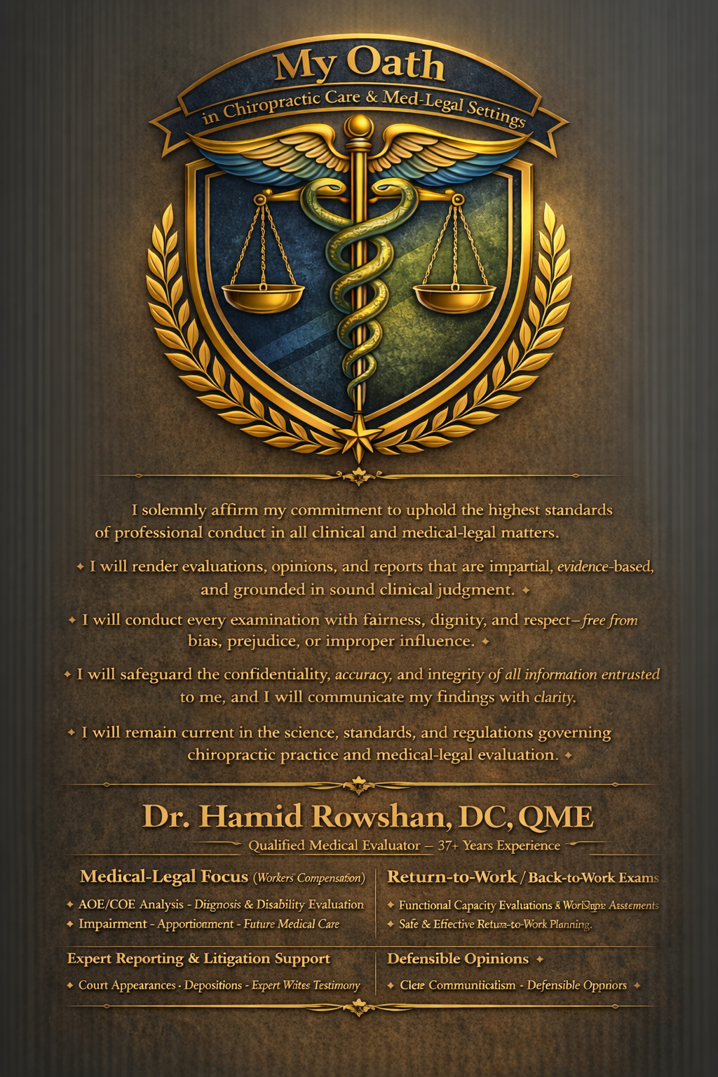 Please email all required documents and the number of days needed for the evaluation to hrowshan@aol.com. We review all requests by email first. If a conversation is necessary, you may call 714‑936‑9700 or 877‑QME‑CHIRO. Once we receive your information, we will arrange the appointment and email you with confirmation
